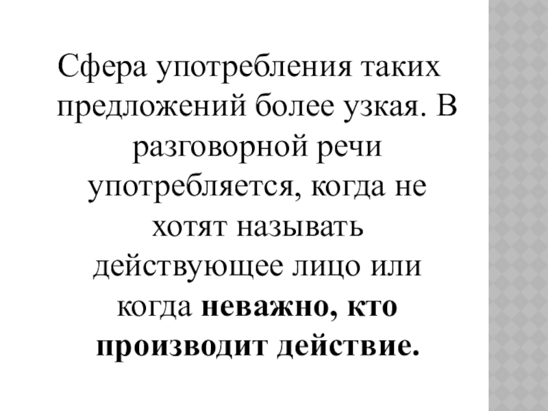 Слайд 9Сфера употребления таких предложений более узкая. В разговорной речи употребляется, когда
