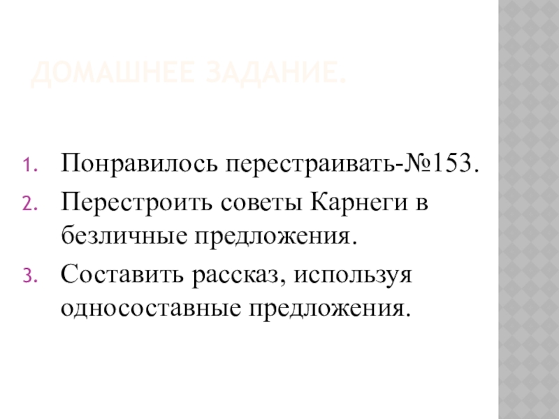 Домашнее задание.Понравилось перестраивать-№153.Перестроить советы Карнеги в безличные предложения.Составить рассказ, используя односоставные предложения.