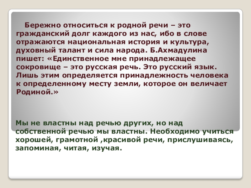 Бережно относиться к родной речи – это гражданский долг каждого из нас, ибо в слове отражаются национальная история и культура, духовный талант и сила народа. Б.Ахмадулина пишет: «Единственное мне принадлежащее сокровище – это русская речь. Это русский язык. Лишь этим определяется принадлежность человека к определенному месту земли, которое он величает Родиной.»