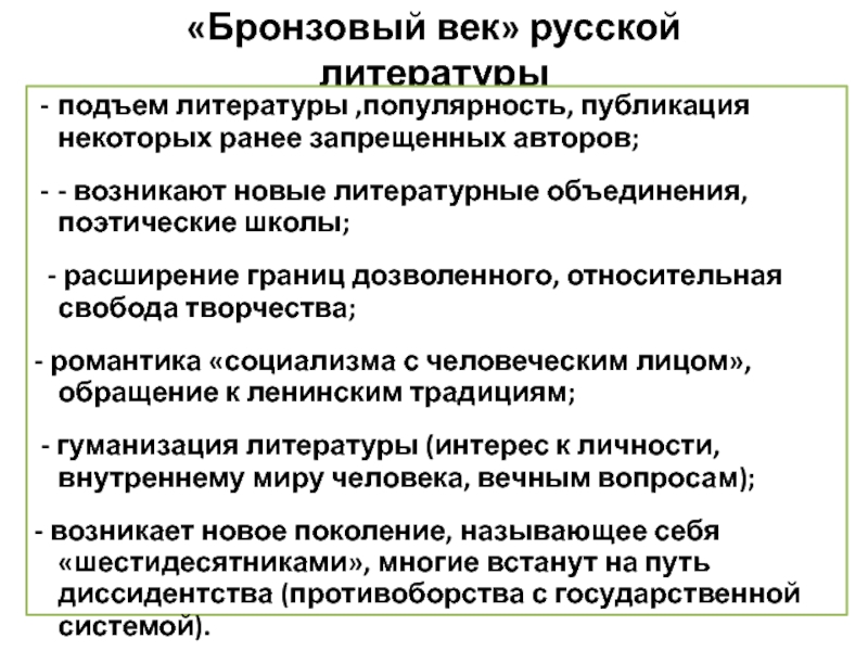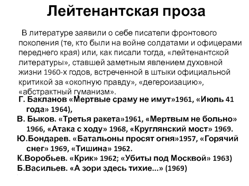В литературе заявили о себе писатели фронтового поколения (те, кто были на войне солдатами и офицерами переднего края) или, как писали тогда, «лейтенантской литературы», ставшей заметным явлением духовной жизни 1960-х годов, встреченной в штыки официальной критикой за «окопную правду», «дегероизацию», «абстрактный гуманизм».