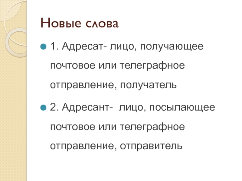 Новые слова 1. Адресат- лицо, получающее почтовое или телеграфное отправление, получатель2. Адресант- лицо, посылающее почтовое или телеграфное