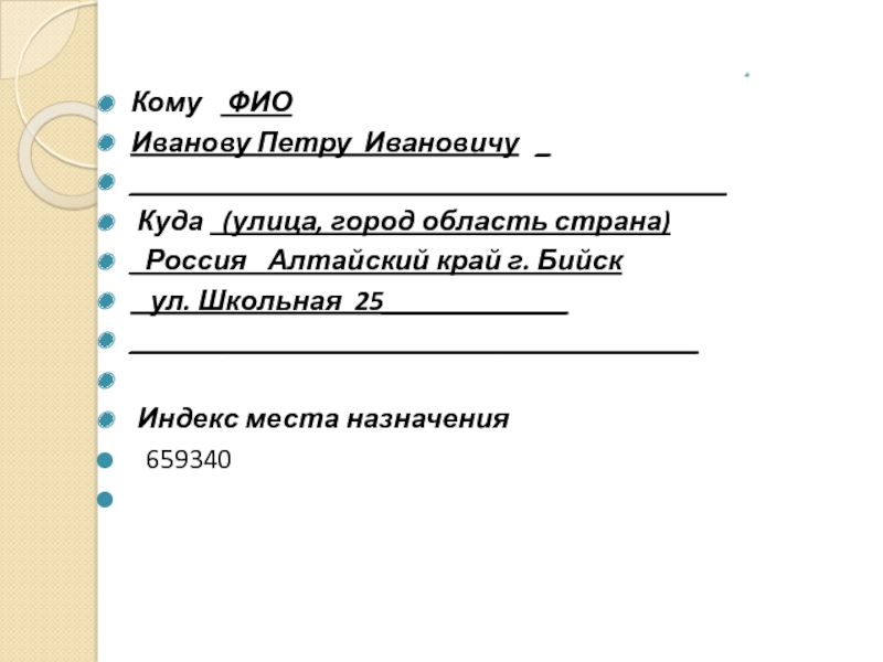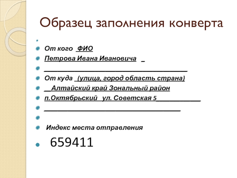 Образец заполнения конверта От кого  ФИОПетрова Ивана Ивановича	___________________________________________От куда  (улица, город область страна)	__Алтайский край Зональный район