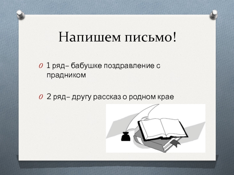Напишем письмо!1 ряд– бабушке поздравление с прадником2 ряд– другу рассказ о родном крае