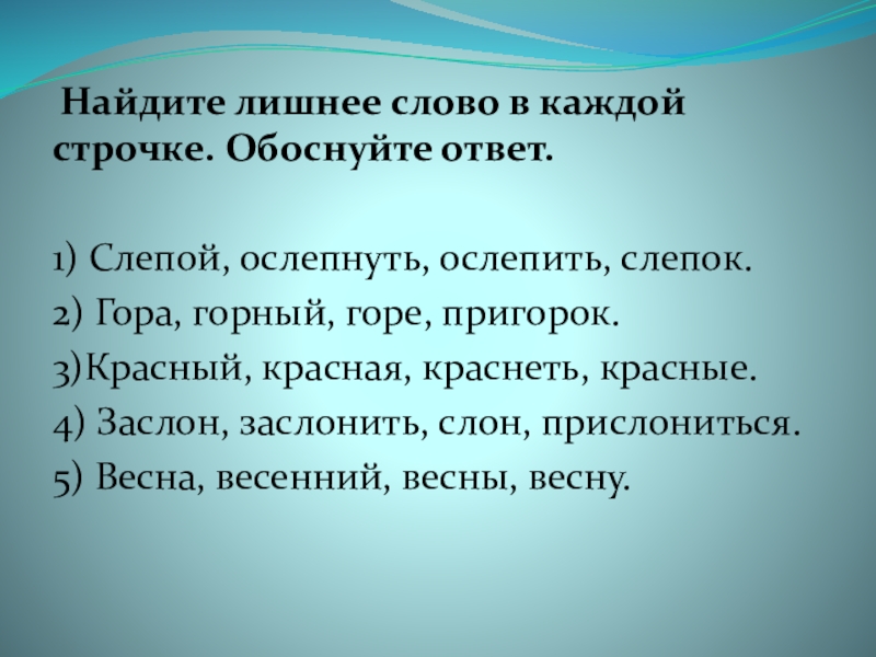 Слайд 6 Найдите лишнее слово в каждой строчке. Обоснуйте ответ.