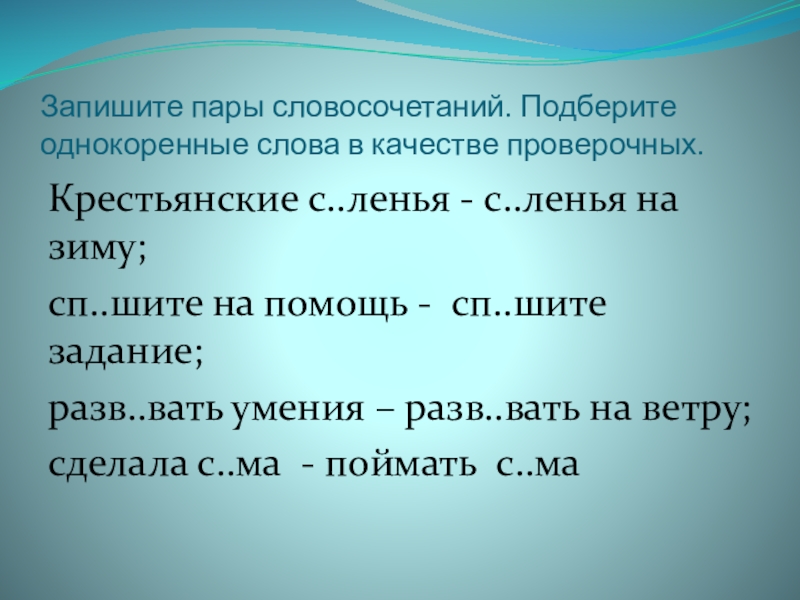 Слайд 7Запишите пары словосочетаний. Подберите однокоренные слова в качестве проверочных.