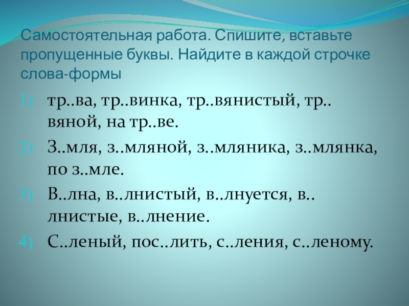 Слайд 4Самостоятельная работа. Спишите, вставьте пропущенные буквы. Найдите в каждой строчке слова-формы