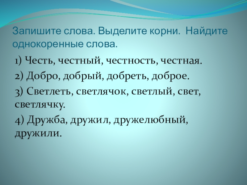 Слайд 3Запишите слова. Выделите корни. Найдите однокоренные слова.