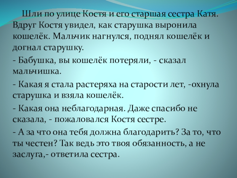 Вдруг Костя увидел, как старушка выронила кошелёк. Мальчик нагнулся, поднял кошелёк и догнал старушку.