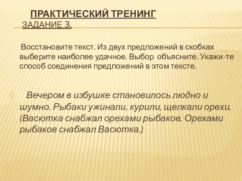 Восстановите текст. Из двух предложений в скобках выберите наиболее удачное. Выбор объясните. Укажи-те способ соединения предложений в этом тексте.