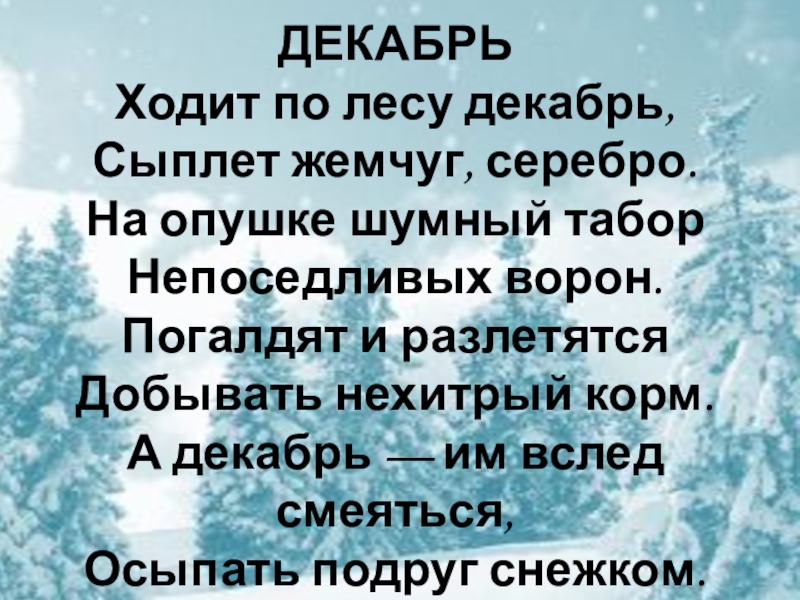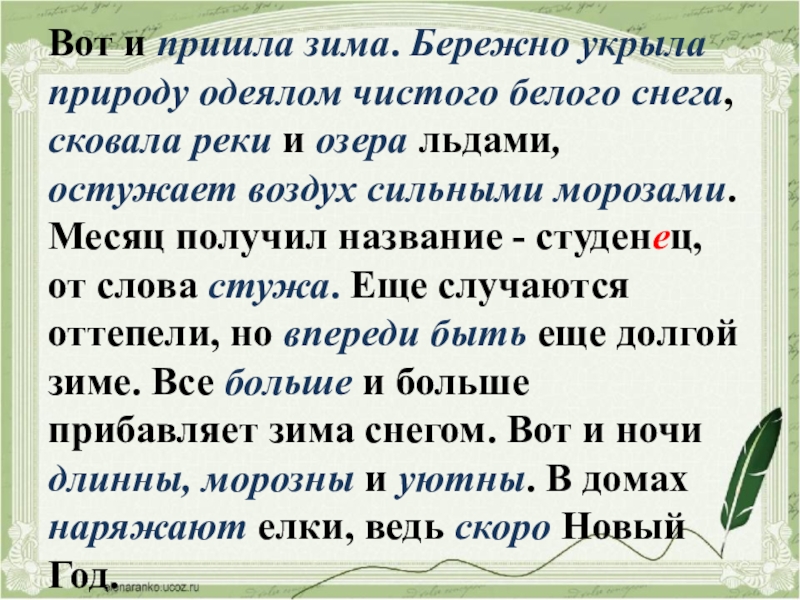 сковала реки и озера льдами, остужает воздух сильными морозами. Месяц получил название - студенец, от слова стужа. Еще случаются оттепели, но впереди быть еще долгой зиме. Все больше и больше прибавляет зима снегом. Вот и ночи длинны, морозны и уютны. В домах наряжают елки, ведь скоро Новый Год.