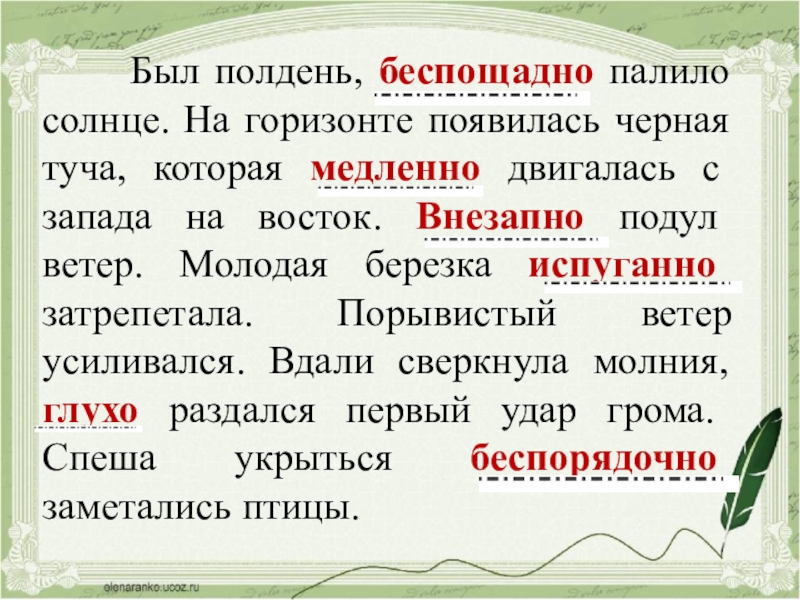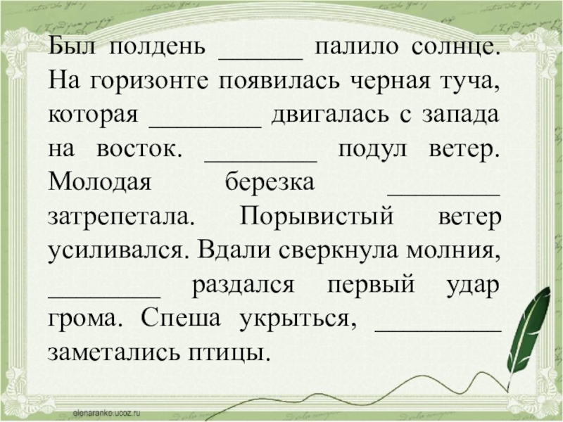 Слайд 13Был полдень ______ палило солнце. На горизонте появилась черная туча, которая