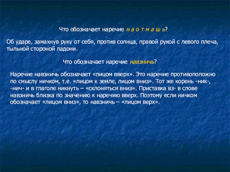 Наречие навзничь обозначает «лицом вверх». Это наречие противоположно по смыслу ничком, т.е. «лицом к земле, лицом вниз». Тот же корень -ник-,