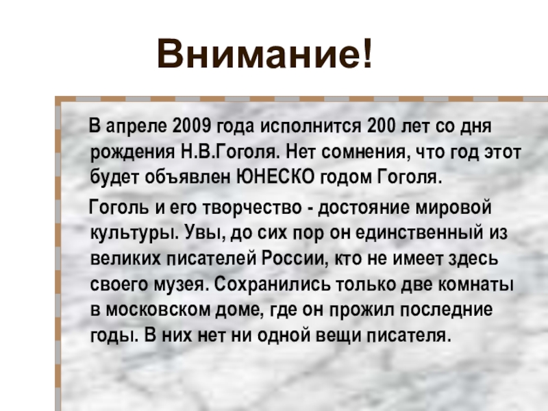 Гоголь и его творчество - достояние мировой культуры. Увы, до сих пор он единственный из великих писателей России, кто не имеет здесь своего музея. Сохранились только две комнаты в московском доме, где он прожил последние годы. В них нет ни одной вещи писателя.
