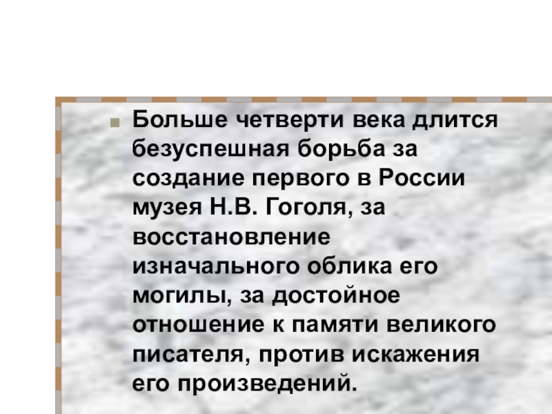 России музея Н.В. Гоголя, за восстановление изначального облика его могилы, за достойное отношение к памяти великого писателя, против искажения его произведений.
