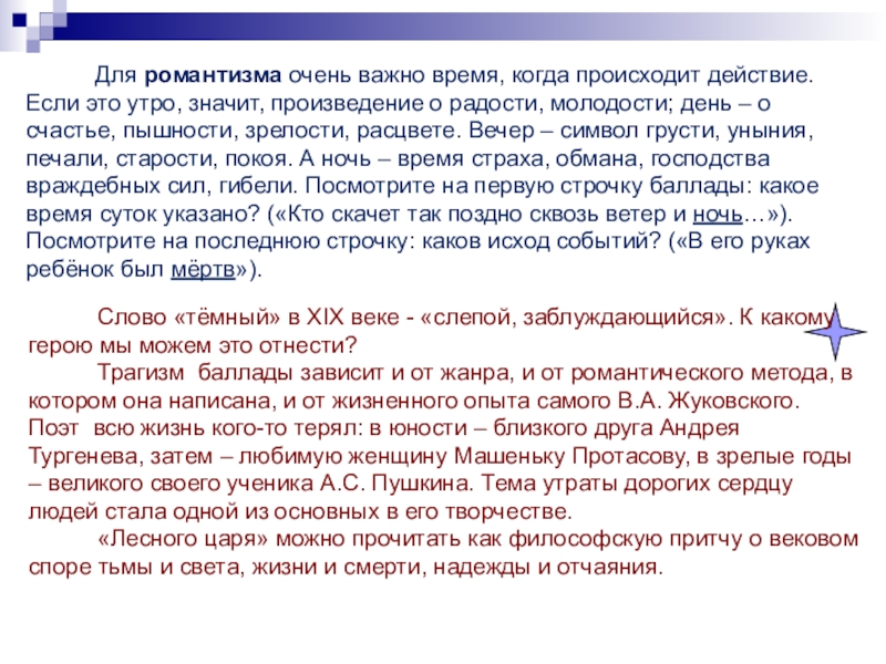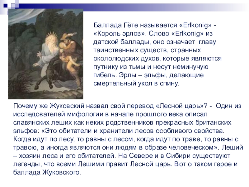 Жуковский в русской литературе прославился своими балладами. Он написал их 39. Большинство из них – вольные переводы стихотворений немецких и английских поэтов. Сам Жуковский так об этом сказал: «Это вообще характер моего авторского творчества: у меня почти всё или чужое, или по поводу чужого - и всё, однако, моё». Из баллады-источника В.А. Жуковский брал только сюжет и на его основе создавал своё оригинальное, неповторимое произведение.