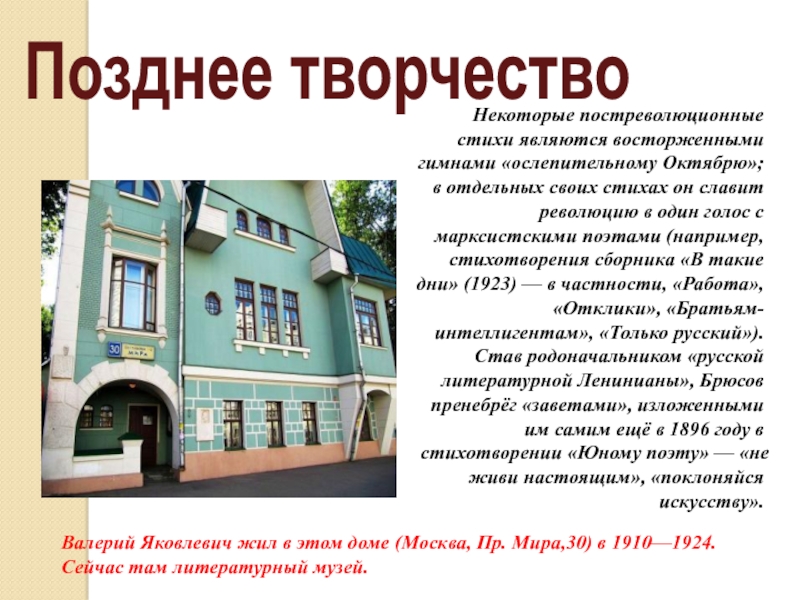 Валерий Яковлевич жил в этом доме (Москва, Пр. Мира,30) в 1910—1924. Сейчас там литературный музей.