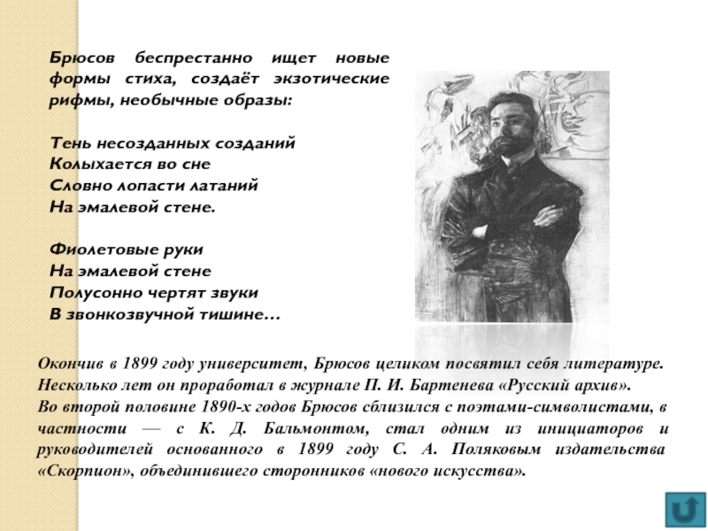 Во второй половине 1890-х годов Брюсов сблизился с поэтами-символистами, в частности — с К. Д. Бальмонтом, стал одним из инициаторов и руководителей основанного в 1899 году С. А. Поляковым издательства «Скорпион», объединившего сторонников «нового искусства».