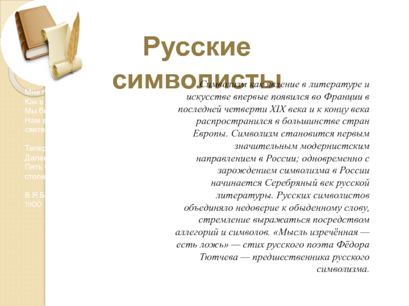 Символизм как явление в литературе и искусстве впервые появился во Франции в последней четверти XIX века и к концу века распространился в большинстве стран Европы. Символизм становится первым значительным модернистским направлением в России; одновременно с зарождением символизма в России начинается Серебряный век русской литературы. Русских символистов объединяло недоверие к обыденному слову, стремление выражаться посредством аллегорий и символов. «Мысль изречённая — есть ложь» — стих русского поэта Фёдора Тютчева — предшественника русского символизма.
