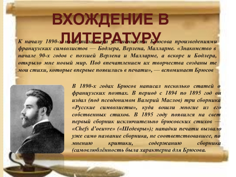 В 1890-х годах Брюсов написал несколько статей о французских поэтах. В период с 1894 по 1895 год он издал (под псевдонимом Валерий Маслов) три сборника «Русские символисты», куда вошли многие из его собственных стихов. В 1895 году появился на свет первый сборник исключительно брюсовских стихов — «Chefs d’oeuvre» («Шедевры»); нападки печати вызвало уже само название сборника, не соответствовавшее, по мнению критики, содержанию сборника (самовлюблённость была характерна для Брюсова.