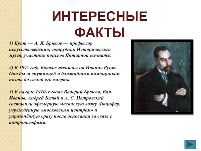 решает стать писателем. Круг интересов гимназиста Брюсова - это литература, история, философия, астрономия. Поступив в 1892 в Московский университет на историческое отделение историко-филологического факультета, он углубленно изучает историю, философию, литературу, искусство, языки.