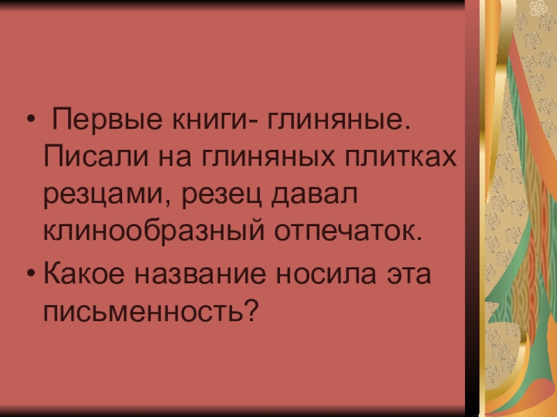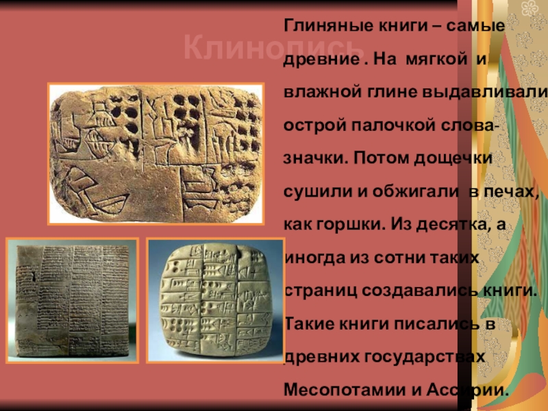 скалах, на каменных плитах и столбах высекали законы, имена царей и памятные события.