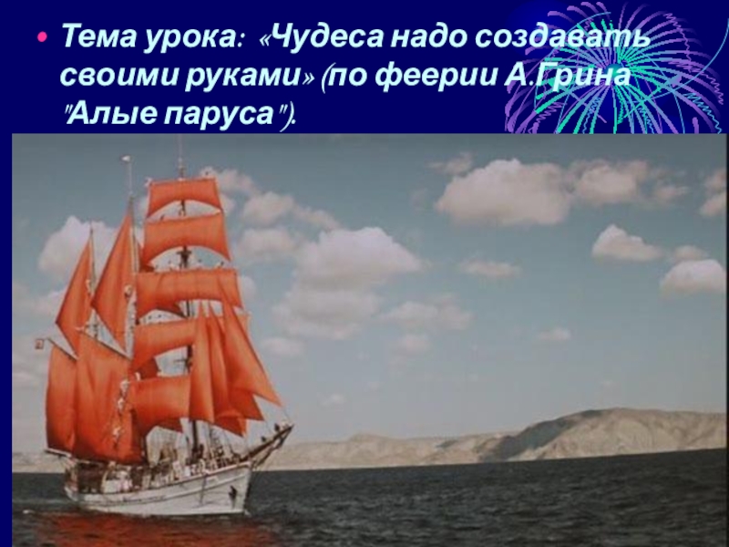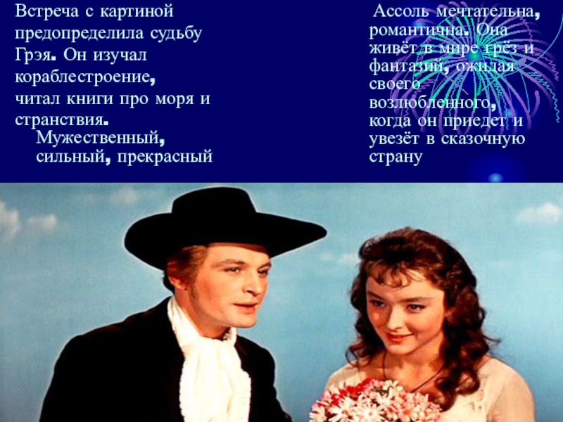 Ассоль мечтательна, романтична. Она живёт в мире грёз и фантазий, ожидая своего возлюбленного, когда он приедет и увезёт в сказочную страну