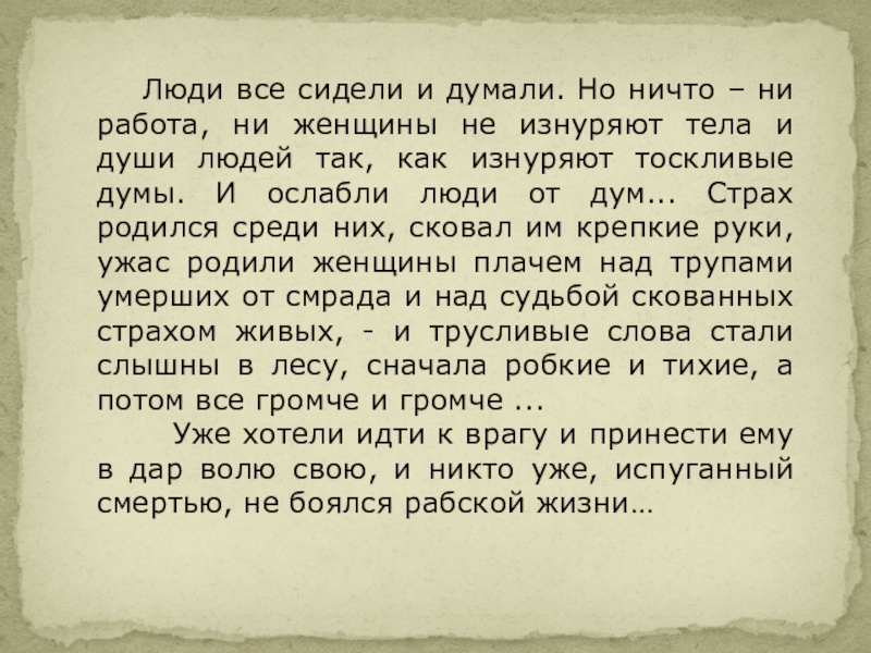 работа, ни женщины не изнуряют тела и души людей так, как изнуряют тоскливые думы. И ослабли люди от дум... Страх родился среди них, сковал им крепкие руки, ужас родили женщины плачем над трупами умерших от смрада и над судьбой скованных страхом живых, - и трусливые слова стали слышны в лесу, сначала робкие и тихие, а потом все громче и громче ...