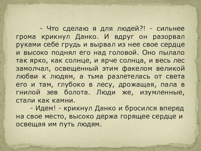 грома крикнул Данко. И вдруг он разорвал руками себе грудь и вырвал из нее свое сердце и высоко поднял его над головой. Оно пылало так ярко, как солнце, и ярче солнца, и весь лес замолчал, освещенный этим факелом великой любви к людям, а тьма разлетелась от света его и там, глубоко в лесу, дрожащая, пала в гнилой зев болота. Люди же, изумленные, стали как камни.