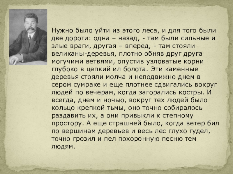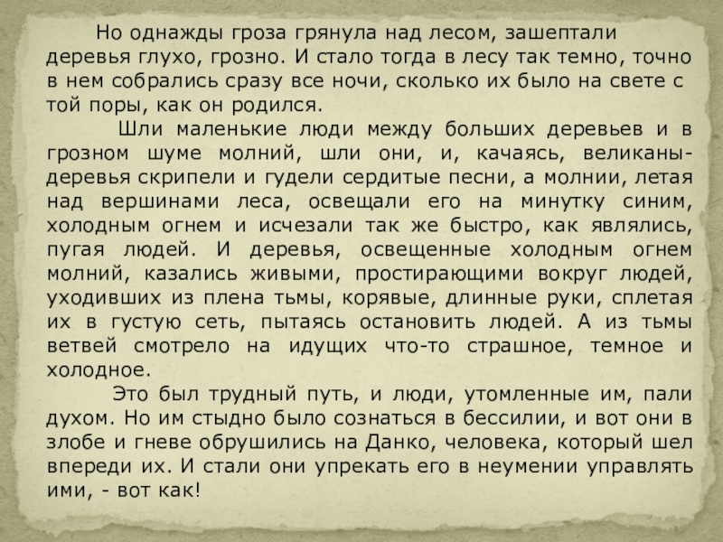 Шли маленькие люди между больших деревьев и в грозном шуме молний, шли они, и, качаясь, великаны-деревья скрипели и гудели сердитые песни, а молнии, летая над вершинами леса, освещали его на минутку синим, холодным огнем и исчезали так же быстро, как являлись, пугая людей. И деревья, освещенные холодным огнем молний, казались живыми, простирающими вокруг людей, уходивших из плена тьмы, корявые, длинные руки, сплетая их в густую сеть, пытаясь остановить людей. А из тьмы ветвей смотрело на идущих что-то страшное, темное и холодное.