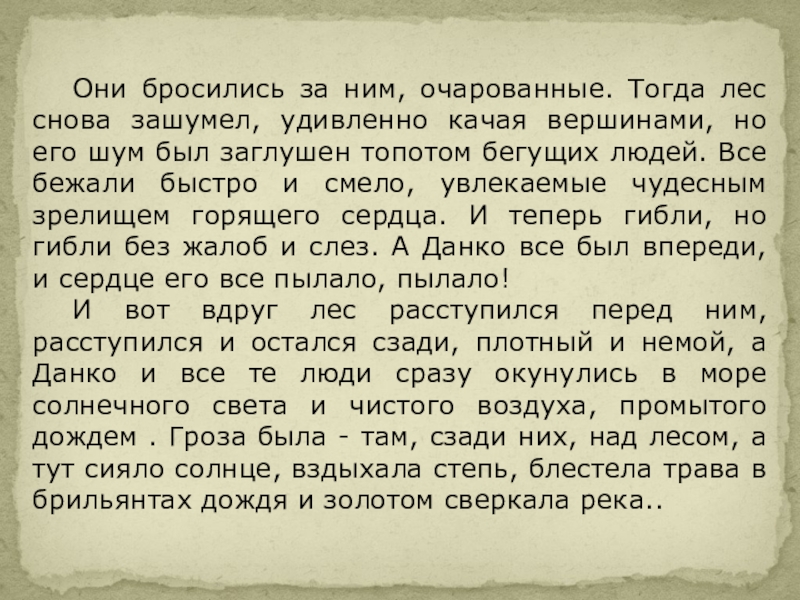 вершинами, но его шум был заглушен топотом бегущих людей. Все бежали быстро и смело, увлекаемые чудесным зрелищем горящего сердца. И теперь гибли, но гибли без жалоб и слез. А Данко все был впереди, и сердце его все пылало, пылало!