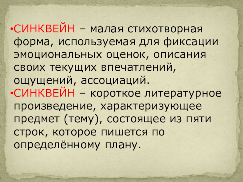 Слайд 19СИНКВЕЙН – малая стихотворная форма, используемая для фиксации эмоциональных оценок, описания