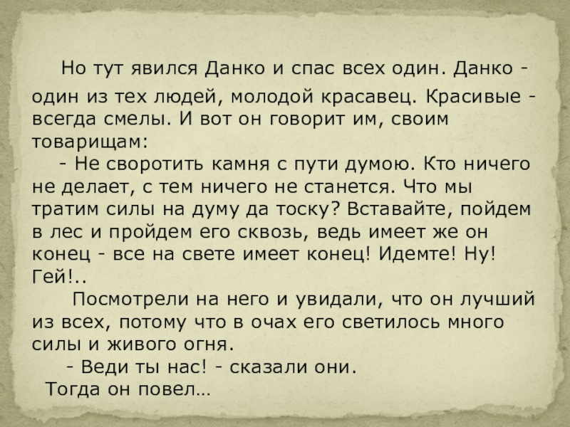 жалости к людям оно погасло. Он любил людей и думал, что, может быть, без него они погибнут. И вот его сердце вспыхнуло огнем желания спасти их, вывести на легкий путь, и тогда в его очах засверкали лучи того могучего огня... А они, увидав это, подумали, что он рассвирепел, отчего так ярко и разгорелись очи, и они насторожились, как волки, ожидая, что он будет бороться с ними, и стали плотнее окружать его, чтобы легче им было схватить и убить Данко. А он уже понял их думу, оттого еще ярче загорелось в нем сердце, ибо эта их дума родила в нем тоску.