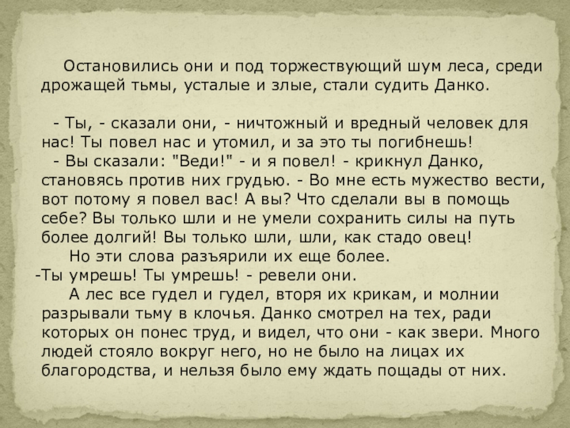 - Вы сказали: "Веди!" - и я повел! - крикнул Данко, становясь против них грудью. - Во мне есть мужество вести, вот потому я повел вас! А вы? Что сделали вы в помощь себе? Вы только шли и не умели сохранить силы на путь более долгий! Вы только шли, шли, как стадо овец!