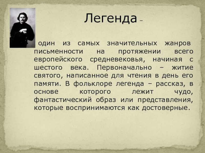 европейского средневековья, начиная с шестого века. Первоначально – житие святого, написанное для чтения в день его памяти. В фольклоре легенда – рассказ, в основе которого лежит чудо, фантастический образ или представления, которые воспринимаются как достоверные.