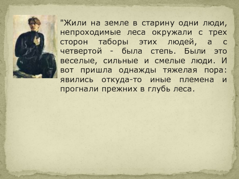 Слайд 6"Жили на земле в старину одни люди, непроходимые леса окружали с