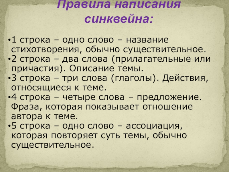 5 строка – одно слово – ассоциация, которая повторяет суть темы, обычно существительное.