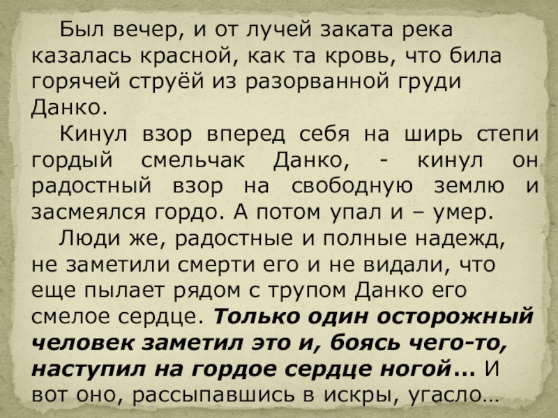 Люди же, радостные и полные надежд, не заметили смерти его и не видали, что еще пылает рядом с трупом Данко его смелое сердце. Только один осторожный человек заметил это и, боясь чего-то, наступил на гордое сердце ногой... И вот оно, рассыпавшись в искры, угасло…