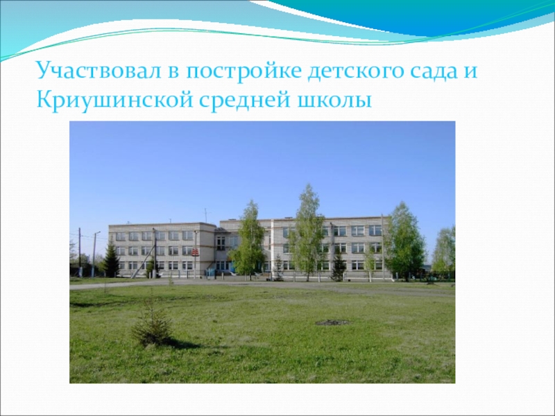 Слайд 9Участвовал в постройке детского сада и Криушинской средней школы