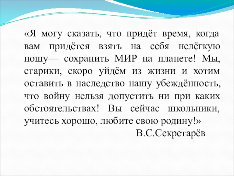 себя нелёгкую ношу— сохранить МИР на планете! Мы, старики, скоро уйдём из жизни и хотим оставить в наследство нашу убеждённость, что войну нельзя допустить ни при каких обстоятельствах! Вы сейчас школьники, учитесь хорошо, любите свою родину!»