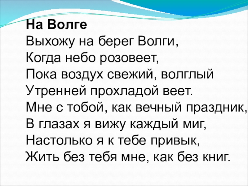 На ВолгеВыхожу на берег Волги,Когда небо розовеет,Пока воздух свежий, волглыйУтренней прохладой веет.Мне с тобой, как вечный праздник,В