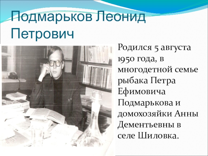 Подмарьков Леонид ПетровичРодился 5 августа 1950 года, в многодетной семье рыбака Петра Ефимовича Подмарькова и домохозяйки Анны
