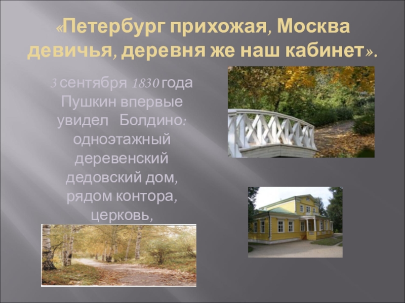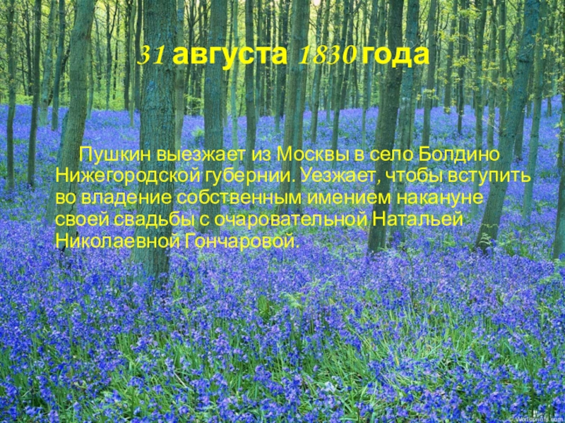 Пушкин выезжает из Москвы в село Болдино Нижегородской губернии. Уезжает, чтобы вступить во владение собственным имением накануне своей свадьбы с очаровательной Натальей Николаевной Гончаровой.