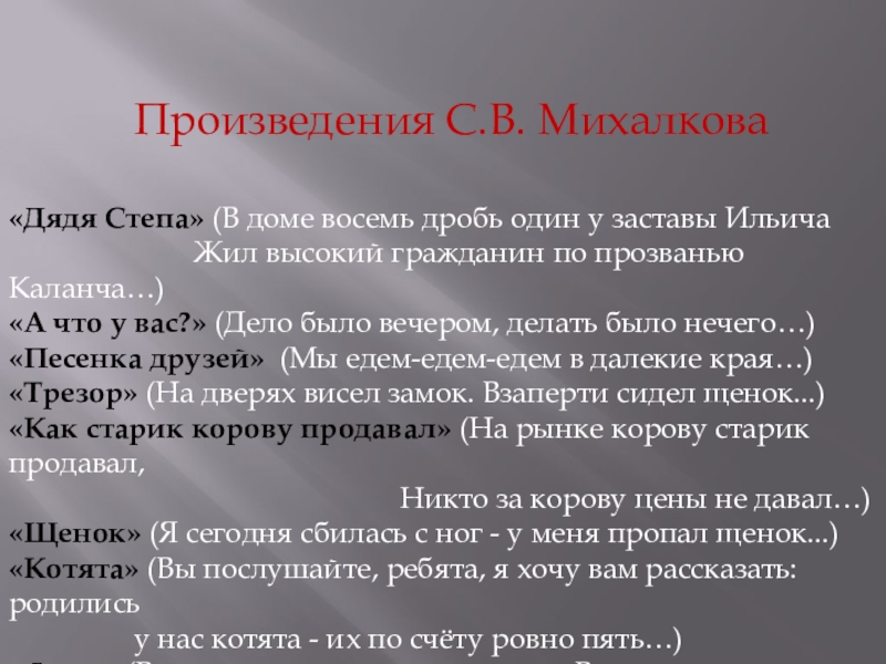 Произведения С.В. Михалкова«Дядя Степа» (В доме восемь дробь один у заставы Ильича