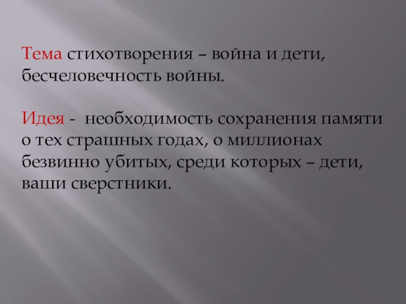 Слайд 5Тема стихотворения – война и дети, бесчеловечность войны.