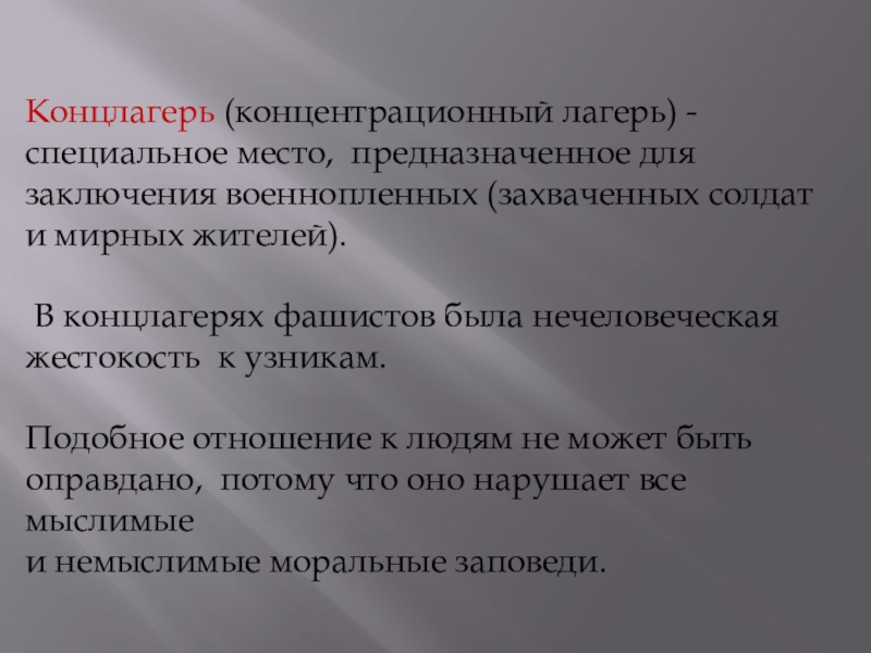 Концлагерь (концентрационный лагерь) - специальное место, предназначенное для заключения военнопленных (захваченных солдат и мирных жителей). В концлагерях