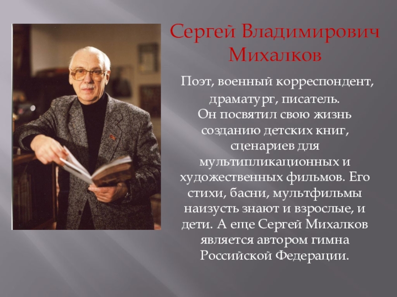 созданию детских книг, сценариев для мультипликационных и художественных фильмов. Его стихи, басни, мультфильмы наизусть знают и взрослые, и дети. А еще Сергей Михалков является автором гимна Российской Федерации.