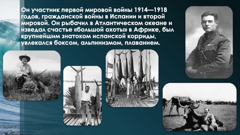 и второй мировой. Он рыбачил в Атлантическом океане и изведал счастье «большой охоты» в Африке, был крупнейшим знатоком испанской корриды, увлекался боксом, альпинизмом, плаванием.