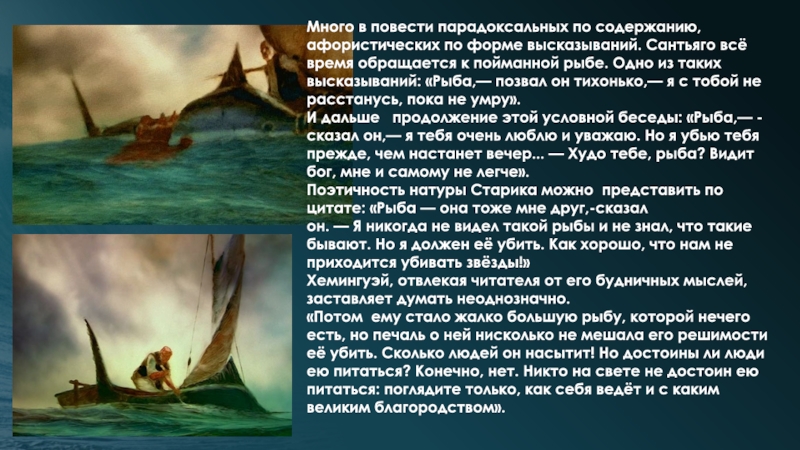 всё время обращается к пойманной рыбе. Одно из таких высказываний: «Рыба,— позвал он тихонько,— я с тобой не расстанусь, пока не умру».