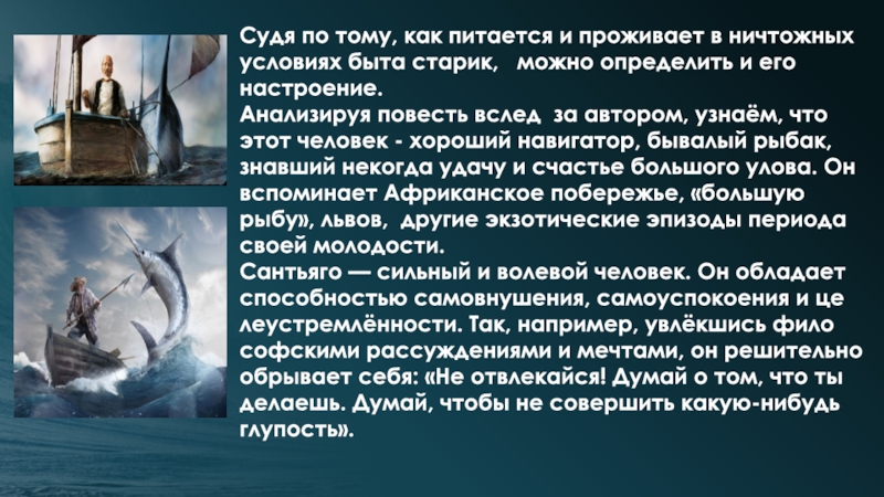 Анализируя повесть вслед за автором, узнаём, что этот человек - хороший навигатор, бывалый рыбак, знавший некогда удачу и счастье большого улова. Он вспоминает Африканское побережье, «большую рыбу», львов, другие экзотические эпизоды периода своей молодости.