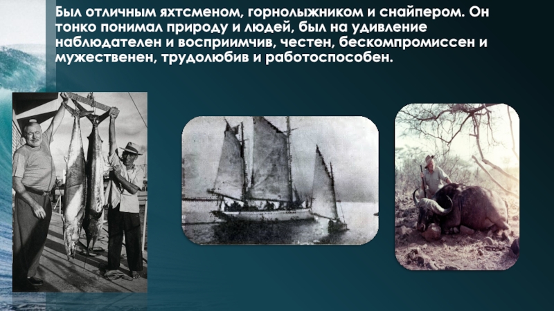 Слайд 4Был отличным яхтсменом, горнолыжником и снайпером. Он тонко понимал природу и
